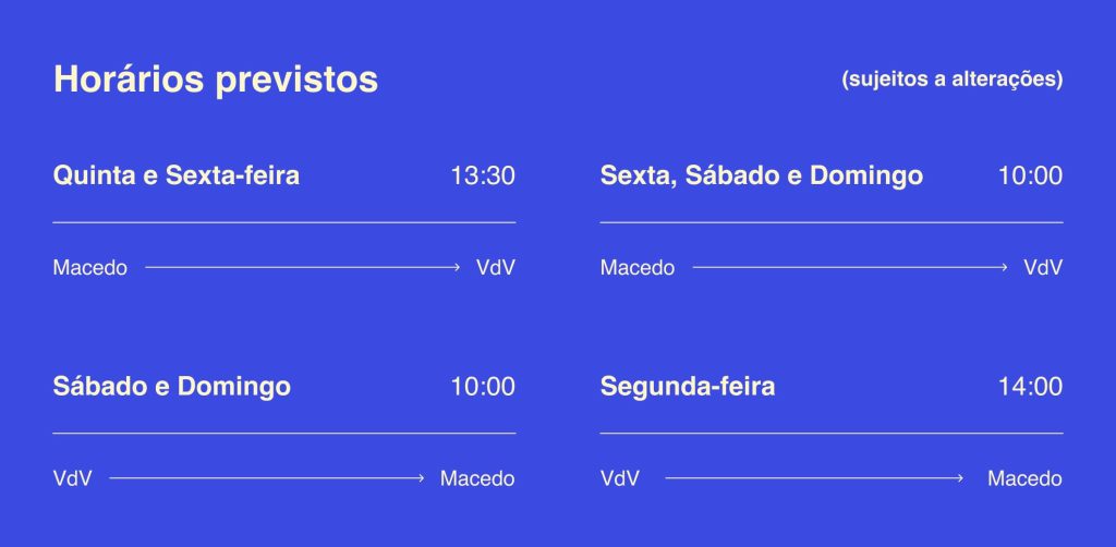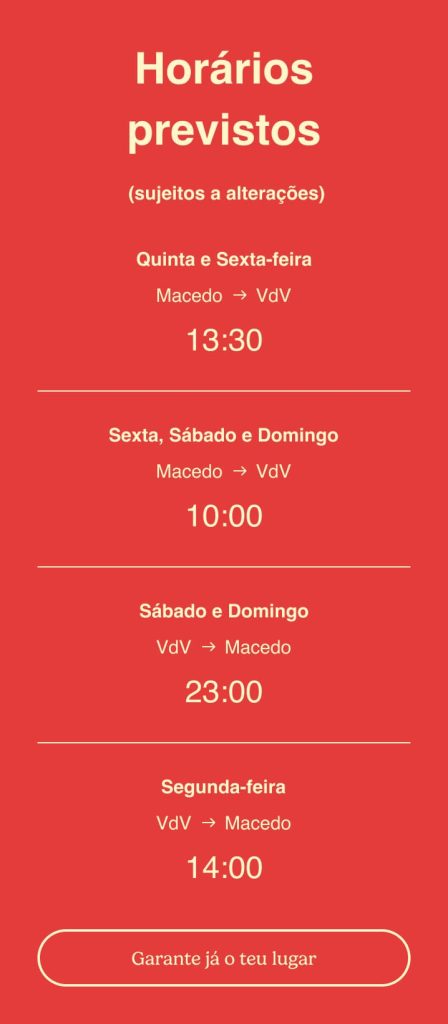 O serviço de transfer só acontece com inscrição prévia. Caso os horários propostos não sirvam, é possível solicitar outras opções via email: boviajar.circbo@ilocal.pt, sujeitas a uma taxa adicional.